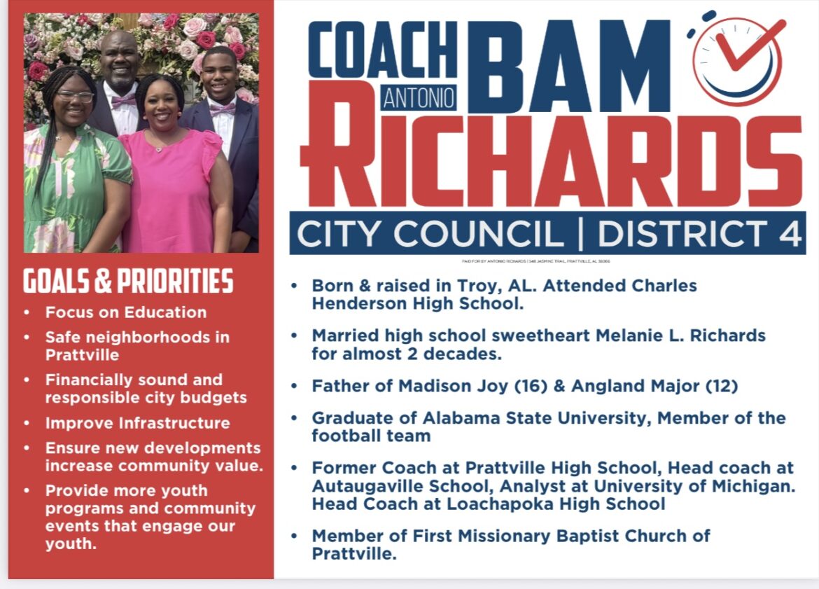 Antonio “Bam” Richards was born on July 4, 1980 in Troy, AL. He is a product of Troy City Schools. He graduated from Charles Henderson High School in 1998. He played on the football team. He made All-State his senior year. He later pursued his career at Alabama State University. He played football for Alabama State. He made All-Swac his senior year. He earned his Bachelor of Science Degree in Physical Education. He has a Masters Degree in Educational Leadership from Alabama State University.