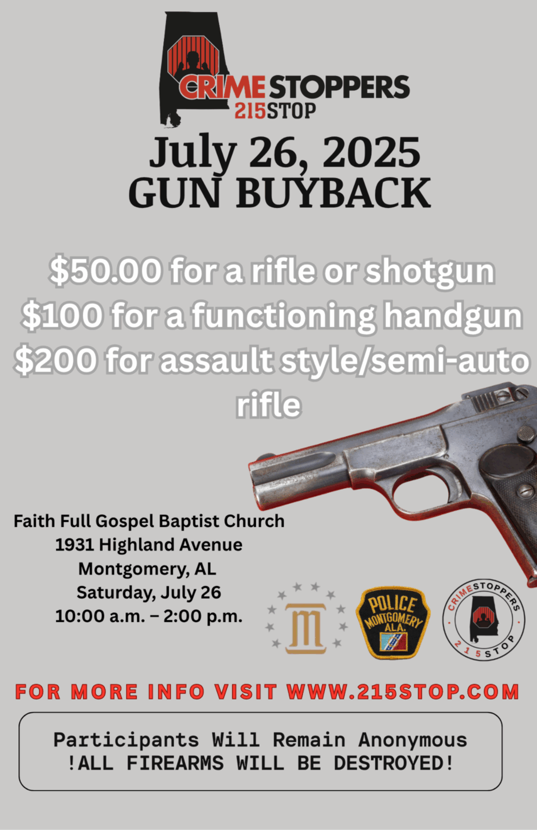 CrimeStoppers 215stop Inc., formerly known as Central Alabama CrimeStoppers, in partnership with the City of Montgomery and the Montgomery Police Department, will host an anonymous Gun Buyback event at Faith Full Gospel Baptist Church, located at 1931 Highland Avenue in Montgomery, AL.