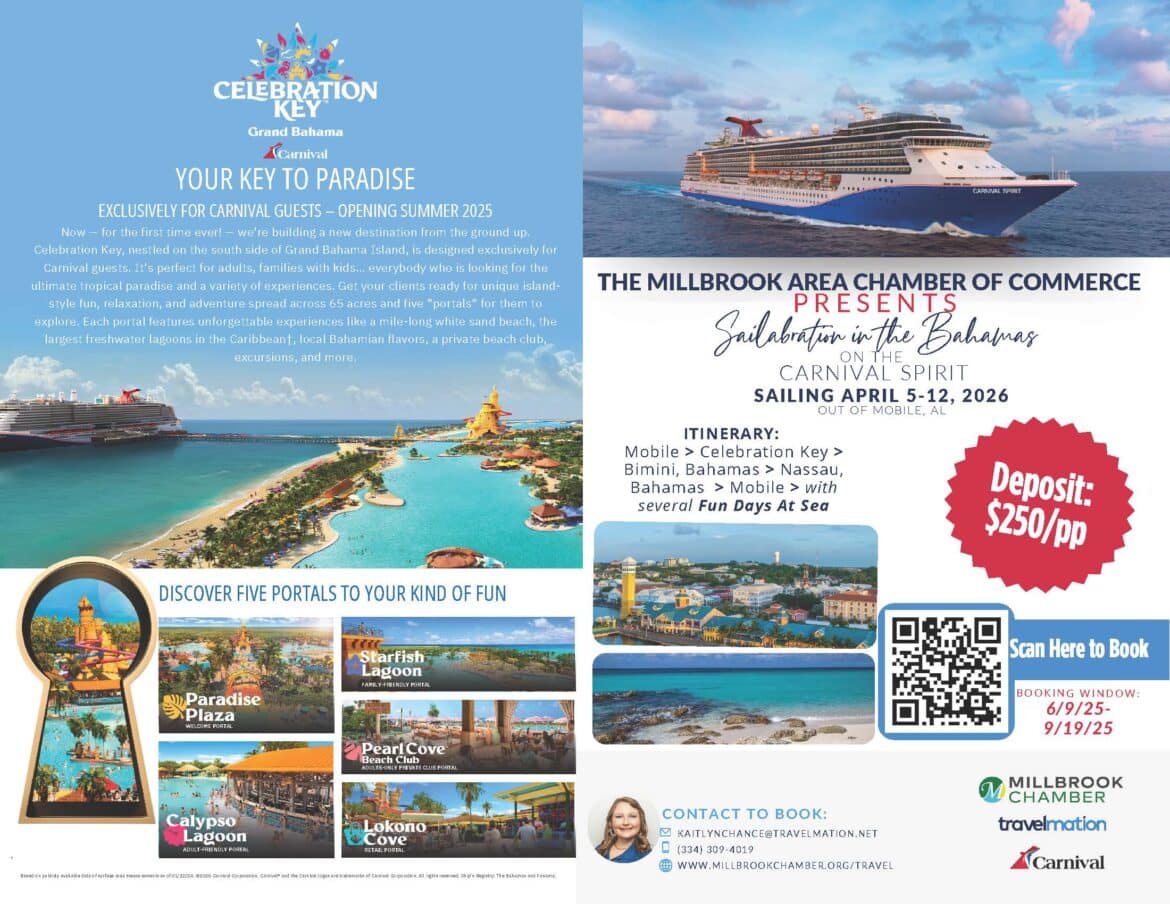 “This cruise is a fantastic way to build lasting memories with fellow travelers and experience the beauty of the Bahamas,” said Brenda Dennis, President & CEO of the Millbrook Area Chamber of Commerce. “Whether you’re a business member, a resident, or simply a fan of group travel, we invite you to join us for this tropical getaway.”