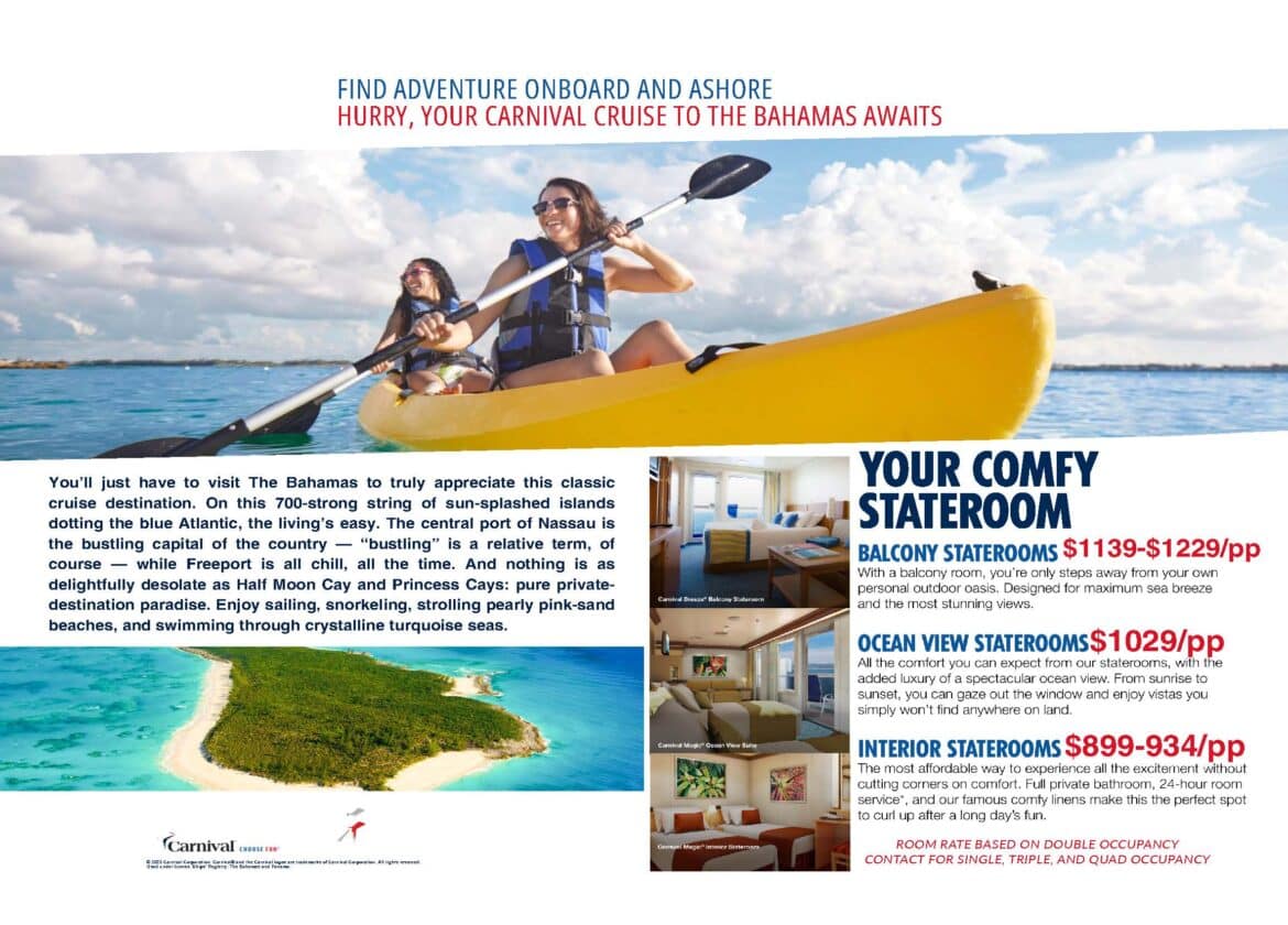 This tropical adventure is part of the Chamber’s popular “Travel with the Chamber” program, designed to bring members of the community together for unforgettable travel experiences. The upcoming cruise will visit several breathtaking destinations, including Celebration Key (Carnival’s newest exclusive port in Grand Bahama), Bimini, and Nassau, with multiple Fun Days at Sea for relaxation and onboard exploration.