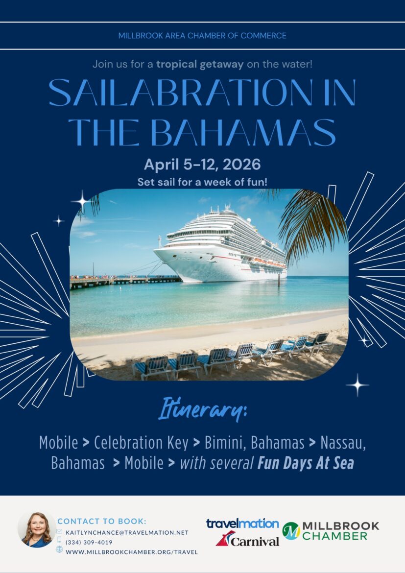 Millbrook, AL – The Millbrook Area Chamber of Commerce is thrilled to announce its 2026 group travel experience: Sailabration in the Bahamas, a seven-night cruise aboard the Carnival Spirit, setting sail April 5–12, 2026, from Mobile, Alabama.