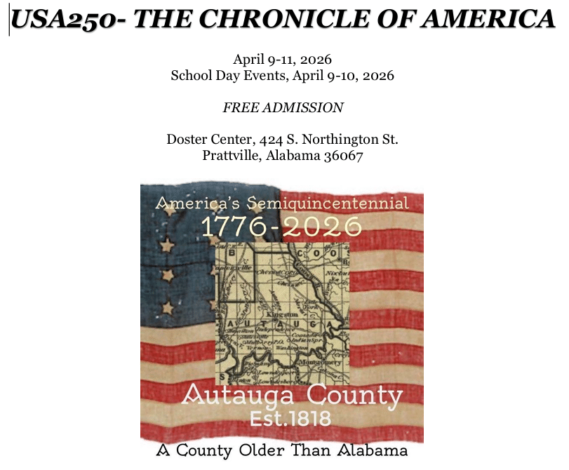 In 2026, our country will celebrate the 250th anniversary of the signing of the Declaration of Independence. Old Autauga Historical Society is hosting some special local events to celebrate this special occasion. Our biggest event will be a special venue, Chronicle of America, which will be held April 9-11, 2026 at the Doster Center in Prattville. The venue will include 250 displays depicting 250 years of US History (1776-2026). The venue covers many subjects including history, religion, science, literature, art, music, agriculture, movies, toys, etc. The exhibit will be one of a kind, and will include US history, Alabama history, and local history.