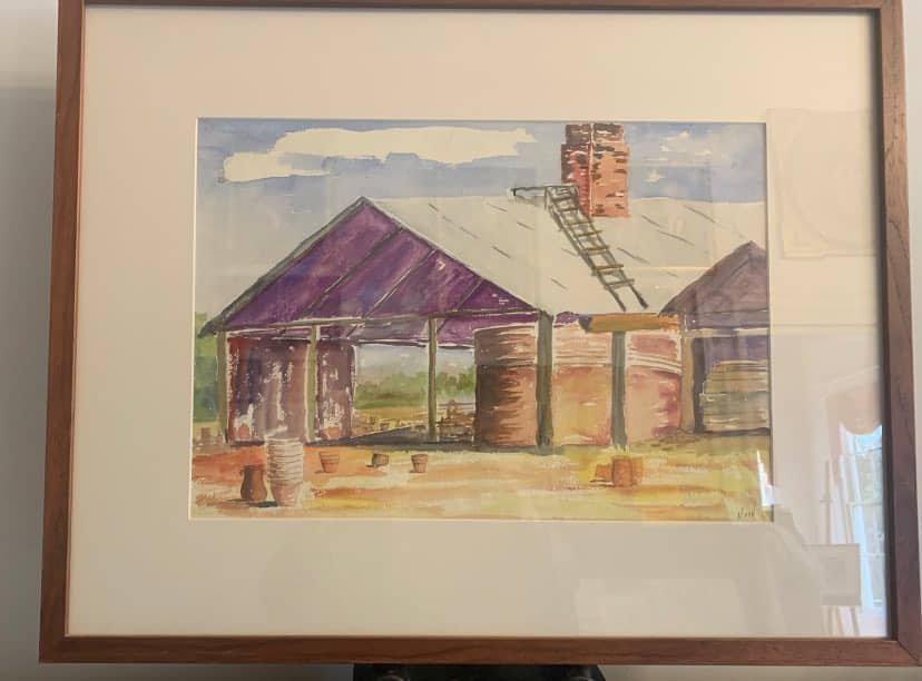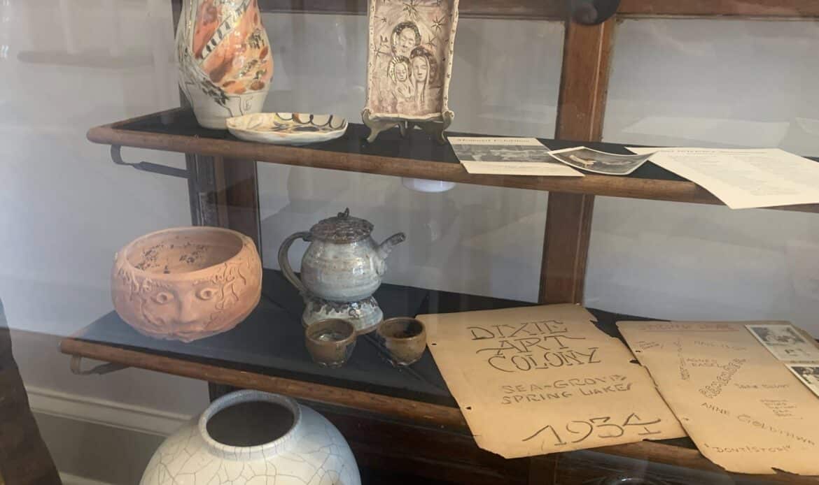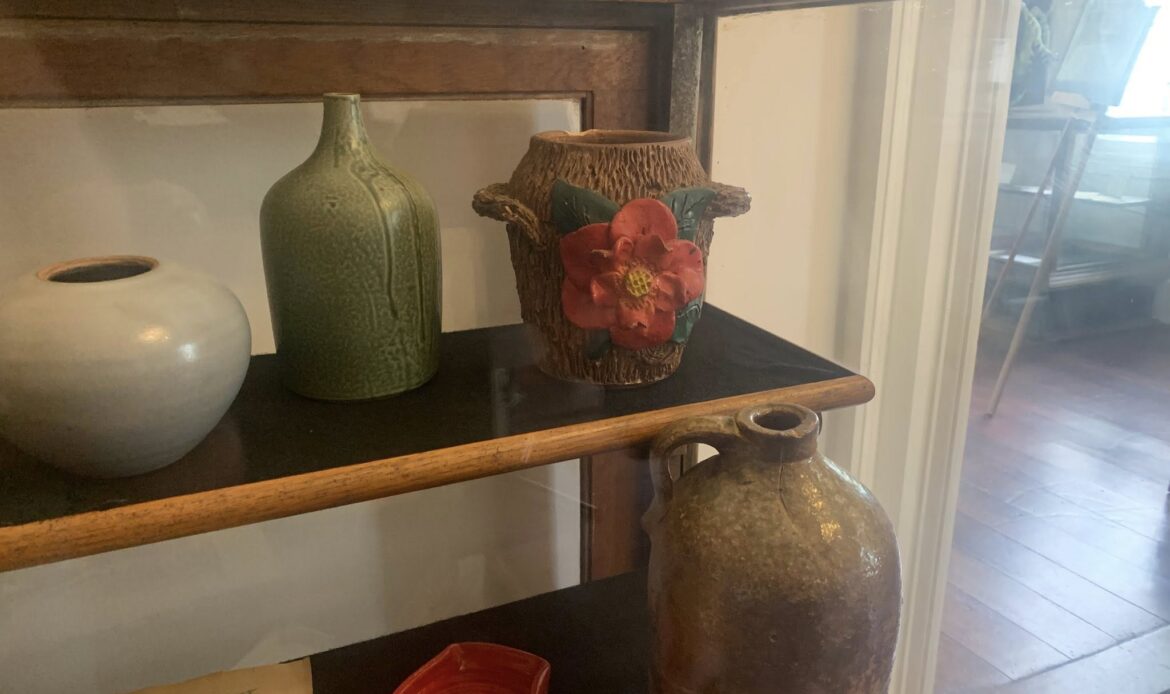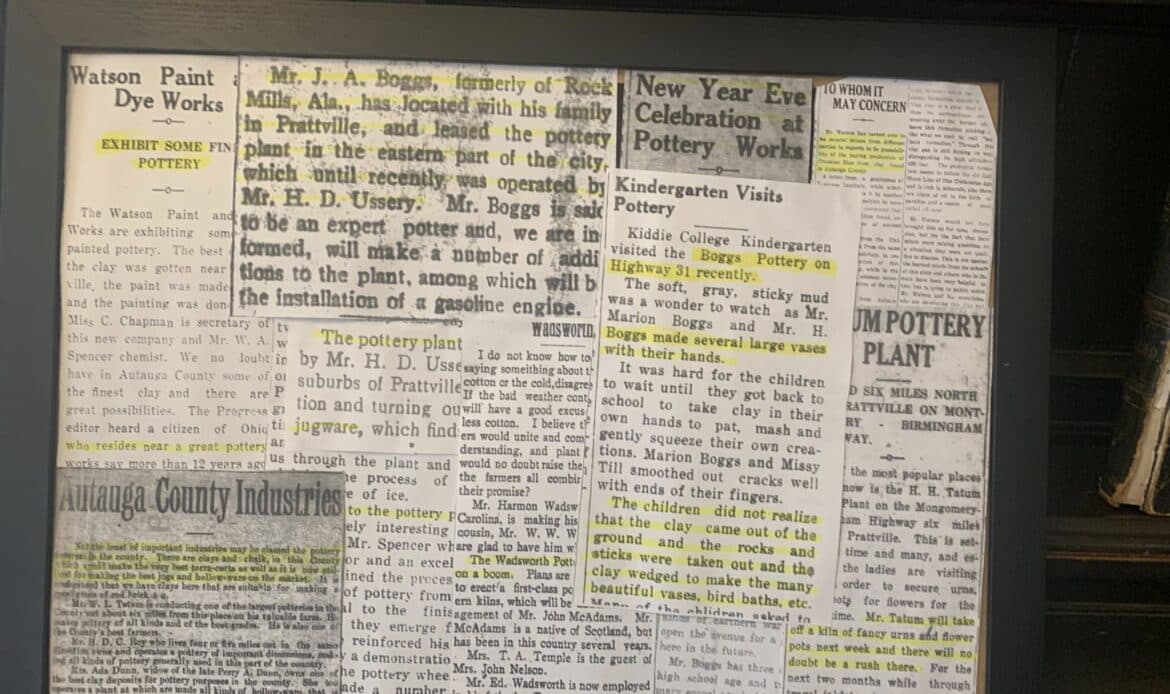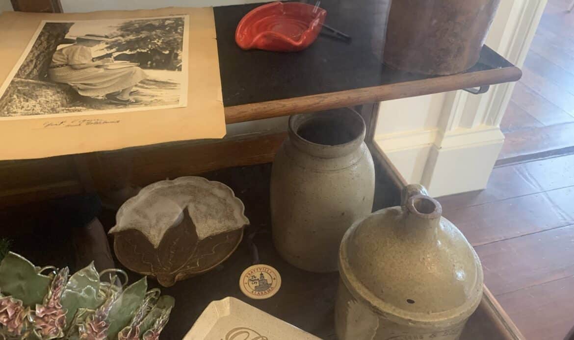 The DIXIE ART COLONY (DAC) Foundation partnered with ACHA on this exhibit. DAC artists, located in central Alabama, traveled the area painting local sites. Several original examples by DAC artists are found in the exhibit. A watercolor and pencil sketch of Bogg’s Pottery by noted Southern artist, Kelly Fitzpatrick, are featured in the display. The interest in the potteries followed the discovery of exceptional clay in Autauga County in the early 1900s attracting potters who came to the Prattville area to create utilitarian pottery for everyday use. Today new homes cover the site of an early pottery, Chalk Hill Pottery, located on Old Ridge Road. Other potteries, Tatum’s, Watson’s preceded the well-known Bogg’s Pottery. Later in the 1940s, a Mr. Spencer came to Prattville and opened a pottery on Highway 31. He was a chemist who was employed by the Prattville Cotton Mill and later served as mayor of the newly incorporated town, Prattmont! A decorated jug made by Spencer is on display. Current artists, Julianne Hansen and Jane Boutwell also contributed pottery works they created.