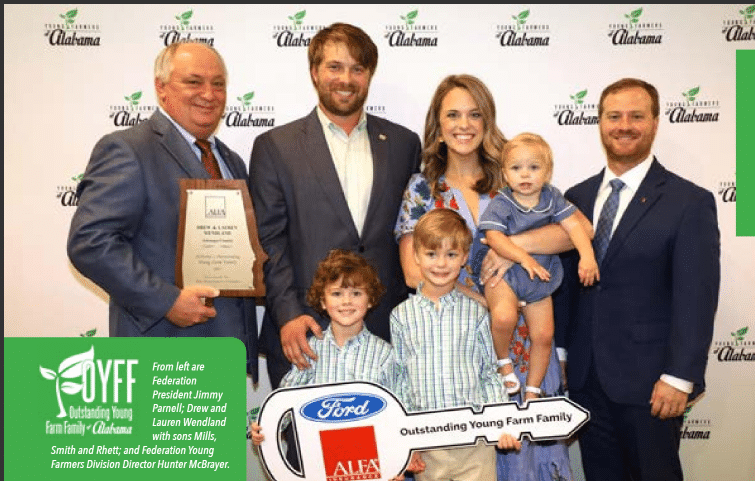 As the OYFF, the Wendlands will receive over $80,000 in prizes including $40,000 toward a new Ford truck compliments of Alfa Insurance; a John Deere 835M Gator sponsored by Alabama Ag Credit and Alabama Farm Credit; and a year’s lease on a John Deere tractor courtesy of John Deere, SunSouth and TriGreen.
