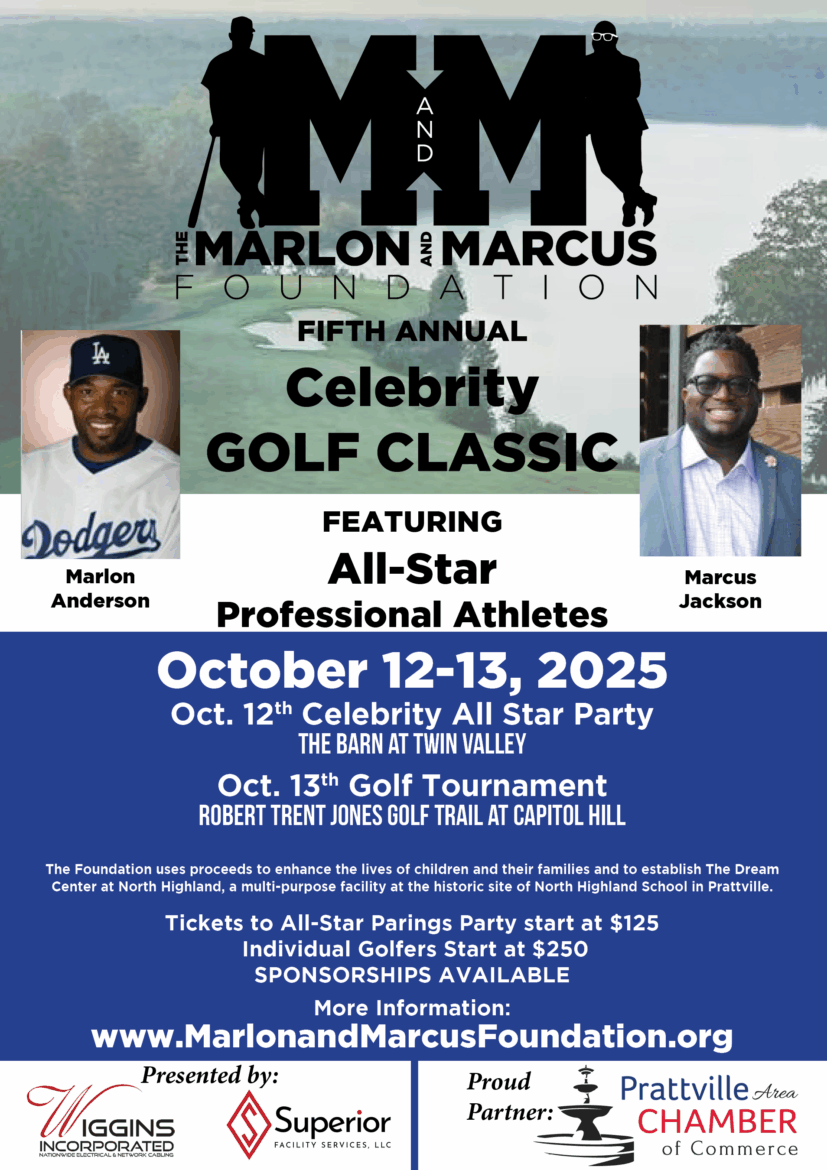“The M&M Foundation’s mission is to give access and exposure to our young people — the true future of our communities,” Jackson said. “Weve’ launched successful programs that create real change, and this tournament helps us continue and expand that work. We’re excited to unite the community for a cause that changes lives.” The Foundation uses the proceeds to improve the lives of children and their families and to establish The Dream Center at North Highland, a versatile facility located on the historic site of North Highland School in Prattville. To register for the tournament, buy pairing party tickets, or learn about sponsorship opportunities, visit The Marlon and Marcus Foundation.