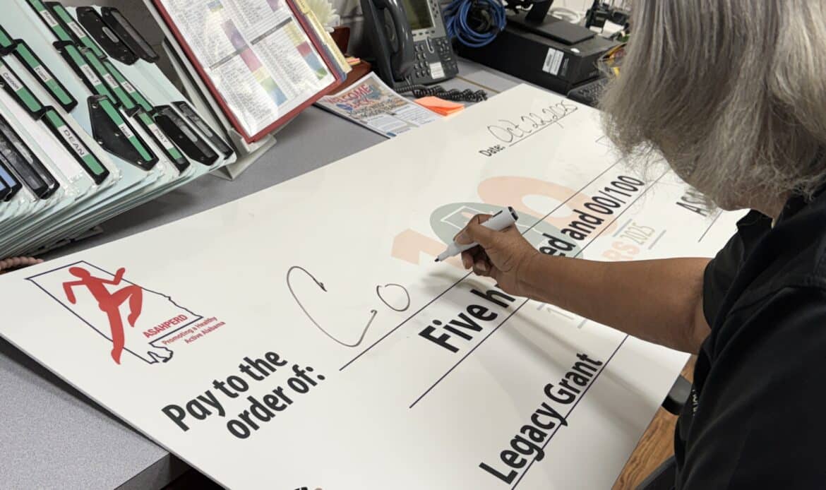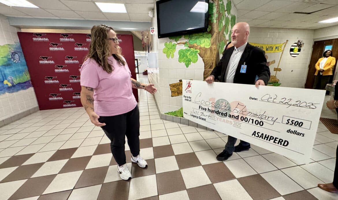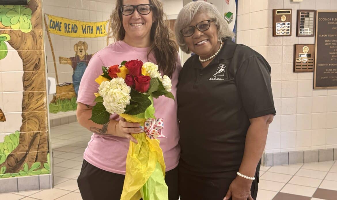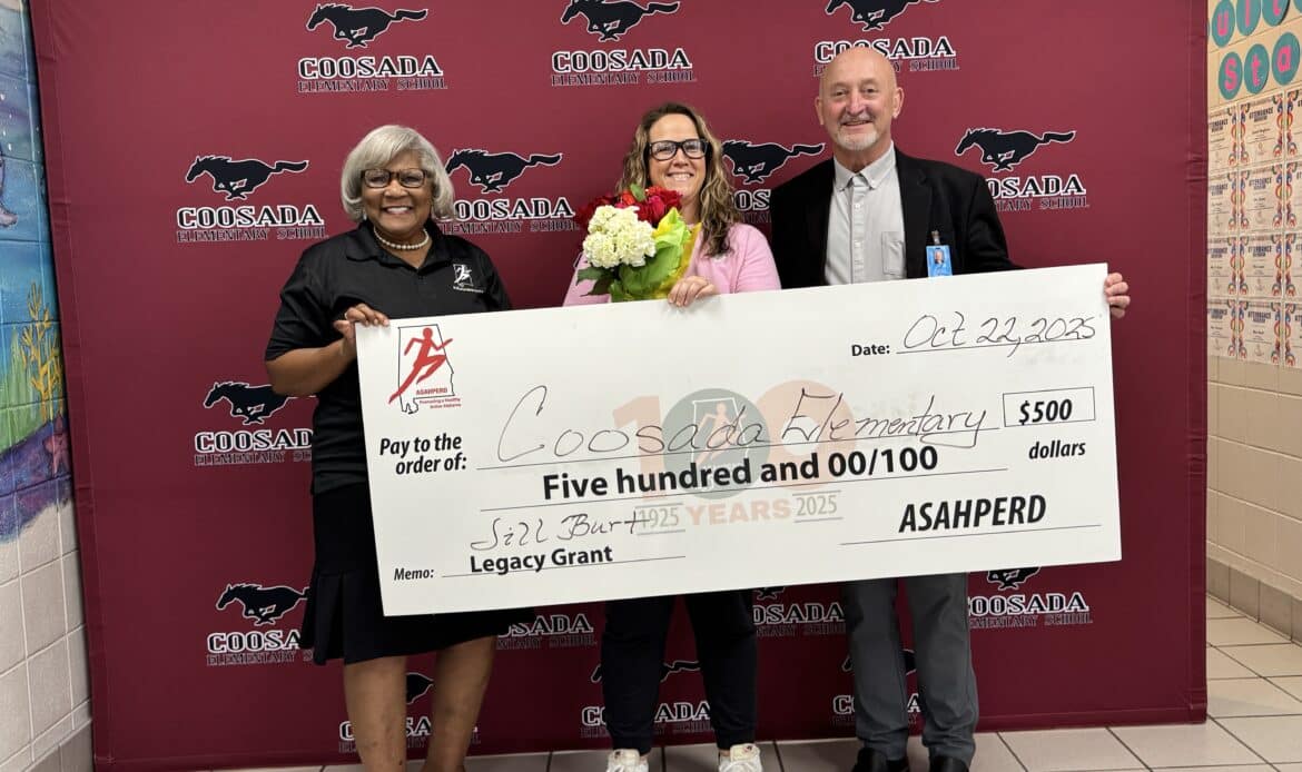 Connie Dacus with the Alabama State Association for Health, Physical Education, Recreation and Dance (ASAHPERD) surprised Jill Burt, the adaptive physical education (PE) teacher for Coosada Elementary School, Oct. 22, 2025, with a check for $500.