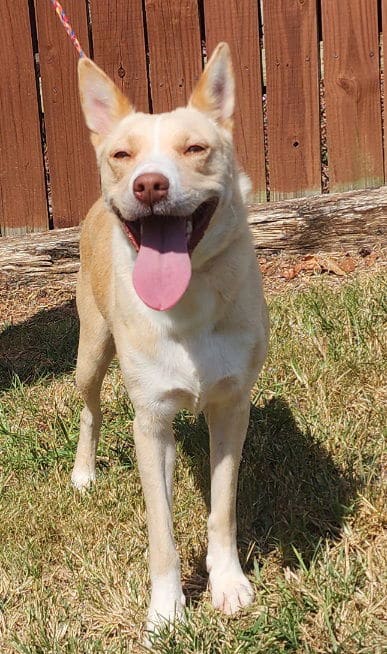 HoneyBun is a two-year old female, about 50 lbs, looks like a possible Heeler/Lab type mix. She is a sweet gal, happy to get attention but also happy to do her own thing. Saying no to young children as she takes treats from us like a hungry piranha so have to watch your fingers. Good with other dogs, will do best with room to hang out outside when she wants to do her own thing. Active gal.