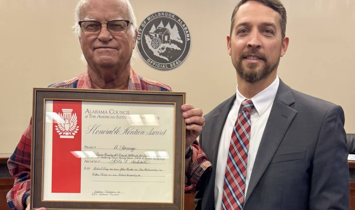 Seay, Seay & Litchfield (SS&L) Architects presented the Alabama Council of the American Institute of Architects’ (AIA’s) 2025 Large-Project Excellence in Design Honorable Mention Award, Dec. 9, 2025, at the Millbrook City Council meeting.