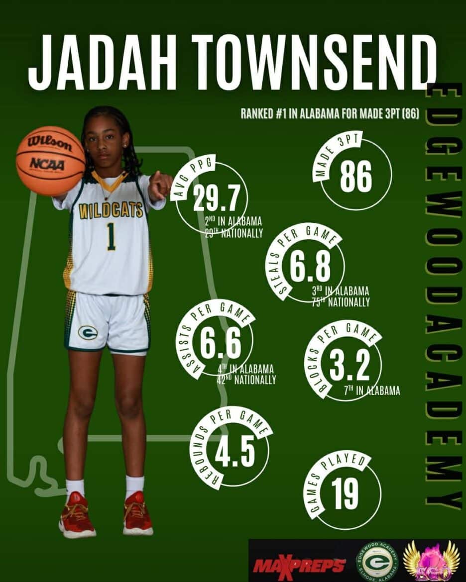 Jadah Townsend is making her mark in the Alabama Independent School Association as just a 6th grader playing for the Edgewood Academy girls’ basketball team. As of last week, through the first 19 games of the season, Townsend had made 86 3-point shots and was averaging 29.2 points per game. She’s not just a scorer. She also averages 6.8 steals, 6.6 assists, and 3.2 blocks. Per Max Preps, Townsend is in the top 10 in Alabama and the top 100 nationally, in each of those categories. She’s also averaging 4.5 rebounds per game.