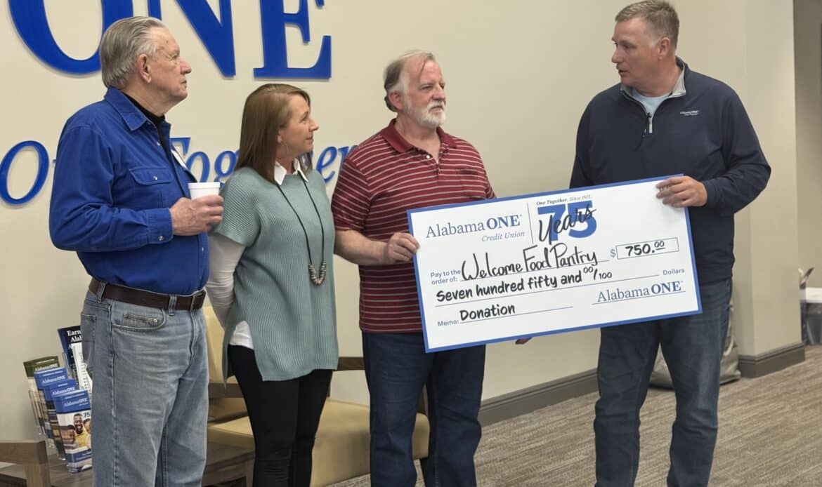 Alabama One Credit Union celebrates 75 years this year. In doing so, the company decided that they wanted to give back with a nod to 75 years by giving back to the local community and donating back to a local nonprofit. They confidently chose to give back to Millbrook’s local food pantry, The Welcome Food Pantry. Alabama One chose to stick with the theme of celebrating 75 years of business by donating $750 dollars to the local Welcome Food Pantry in Millbrook and a promise to be a part of serving and volunteering this year.