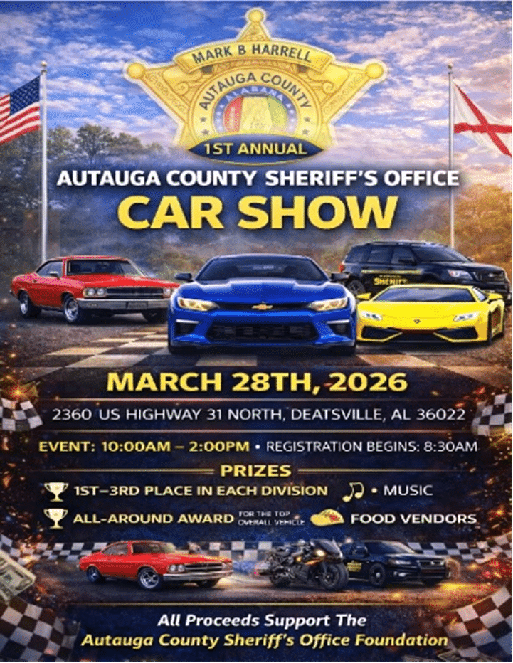 The event is being organized with support from the Autauga County Sheriff’s Foundation, a 501(c)(3) nonprofit. Proceeds from the car show will go toward purchasing equipment for deputies and supporting community initiatives throughout the county.